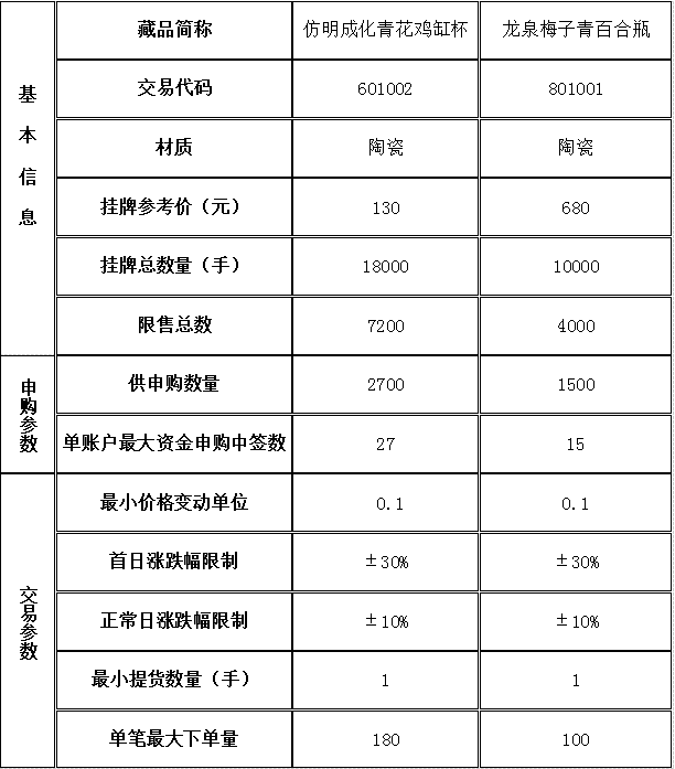 經景德鎮陶瓷交易所有限公司(以下稱本交易所)發行人會員申請,本交易所專家委員會、新藏品掛牌審核小組評估審核通過,對已經完成托管入庫的2只藏品仿明成化青花雞缸杯 、《龍泉梅子青百合瓶》準予在本交易所線上實物交易系統正式掛牌交易,具體事項公告如下: